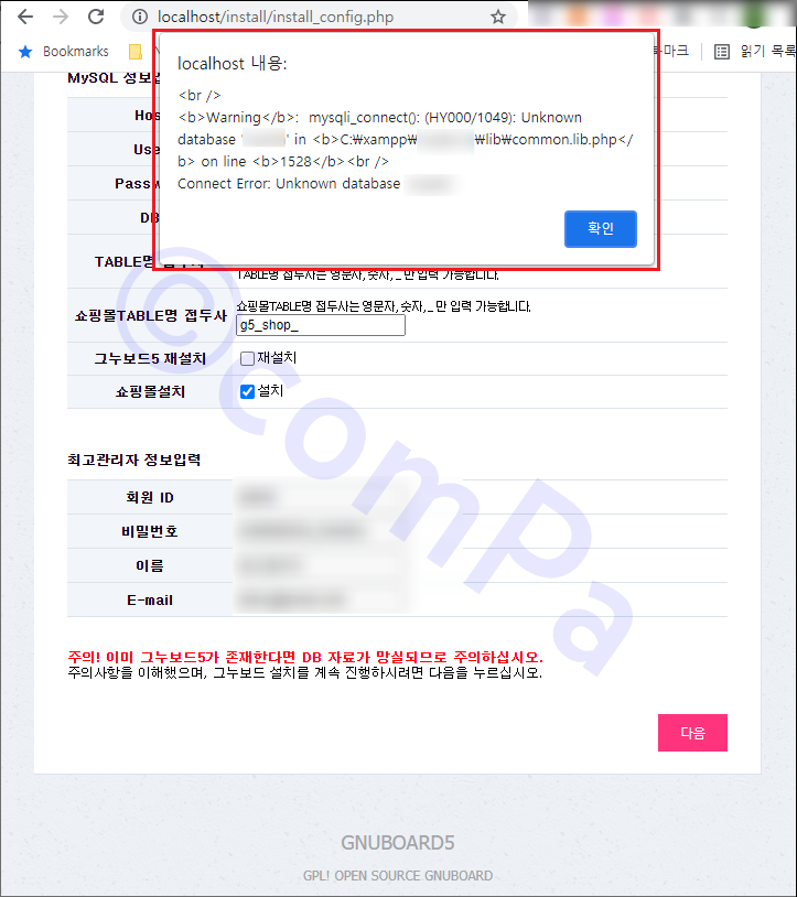 그누보드를 설치하는 중인데 데이터베이스 정보 넣고 다음 버튼을 눌렀는데, 이상한 팝업창이 뜬다.