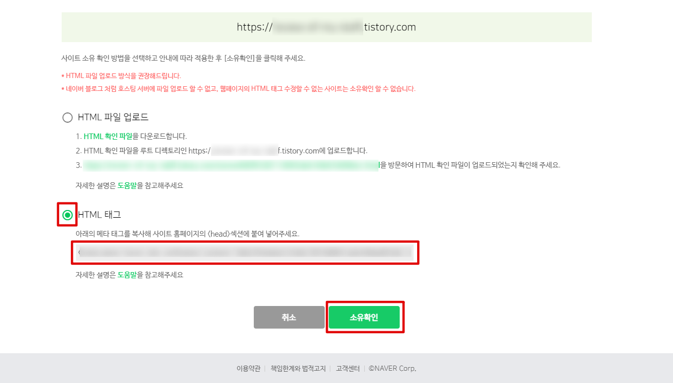 사이트를 등록하면, 이 사이트가 정말 신청자의 소유인지 확인하는 절차를 거칩니다. 두 가지 방법이 있는데요, 티스토리는 HTML 소스 수정이 자유롭기 때문에 HTML 태그를 선택하고 아래 메타태그를 복사해서 티스토리의 HTML head 안에 붙여 넣기 합니다.
